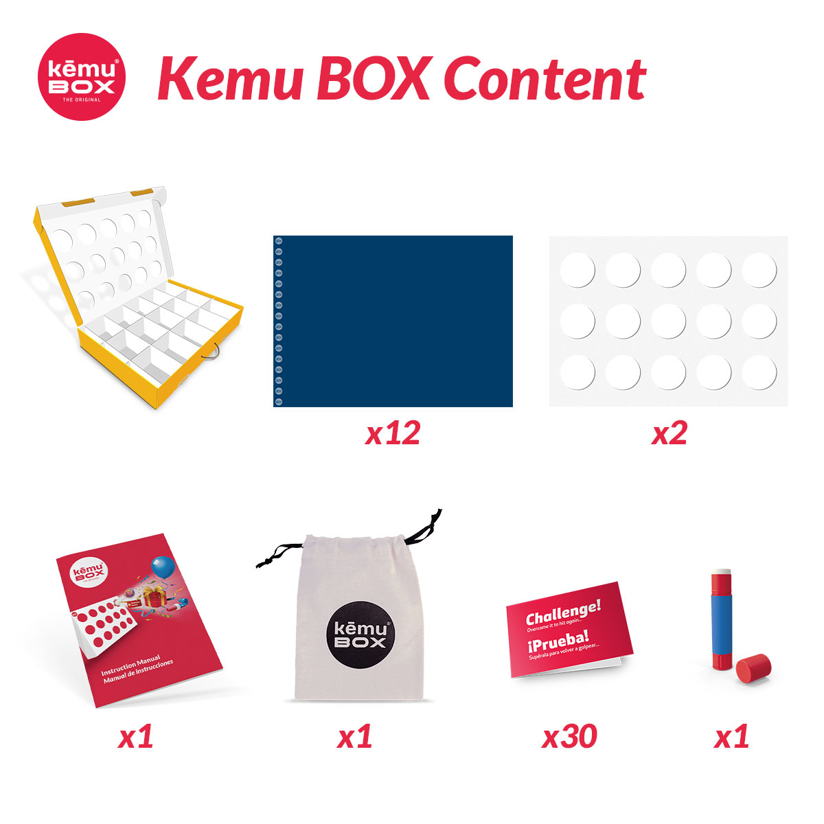 Made of cardboard and paper, with no plastic and easy to assemble. Kemu BOX is ideal for playing, sharing and surprising all your guests.